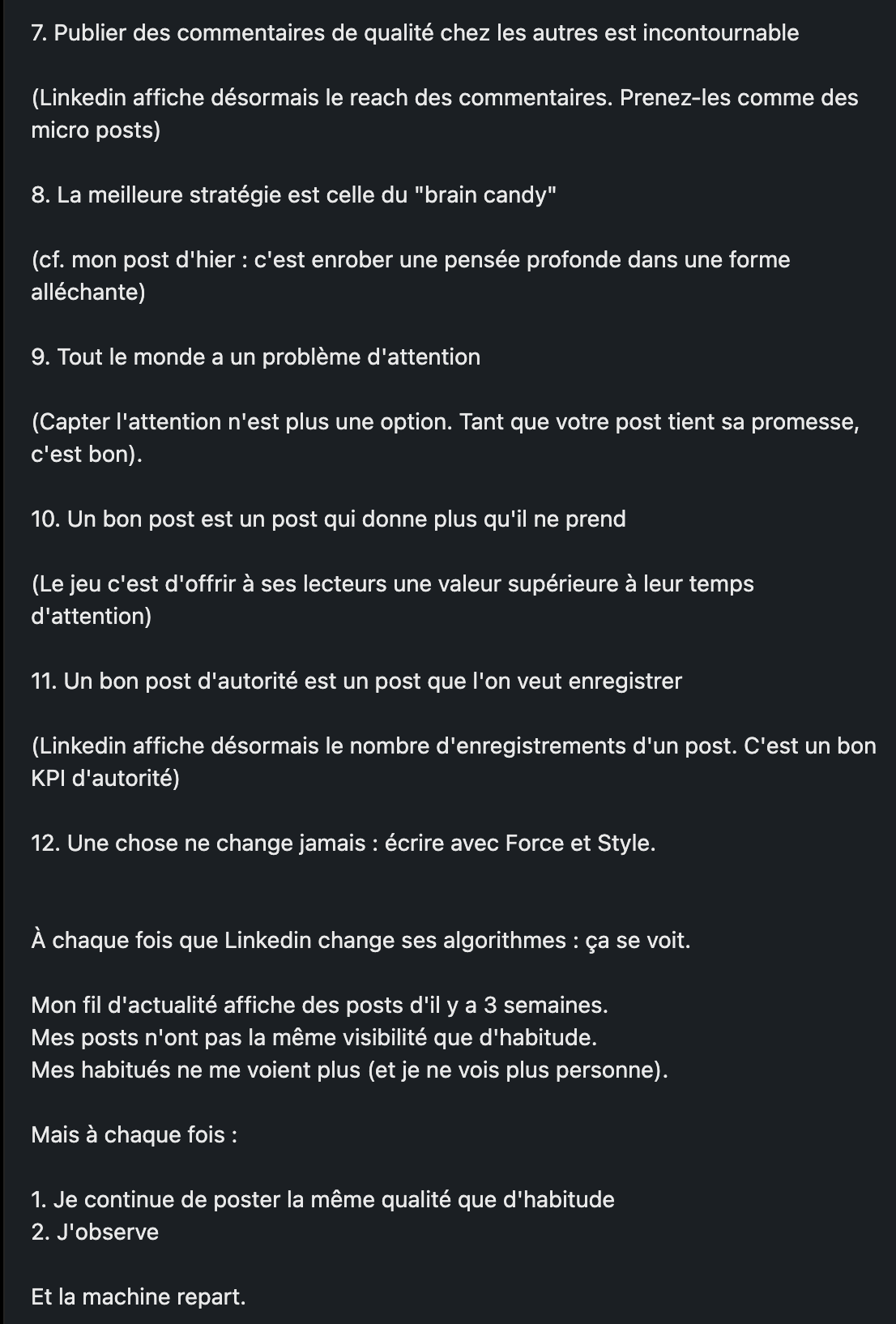 Ce qui est intĂ©ressant ici, ce ne sont pas les chiffres, câest la raison fondamentale qui me permet de âsurvivreâ aux changements des rĂšgles du jeu de Linkedin et m ĂȘme de mâamĂ©liorer.