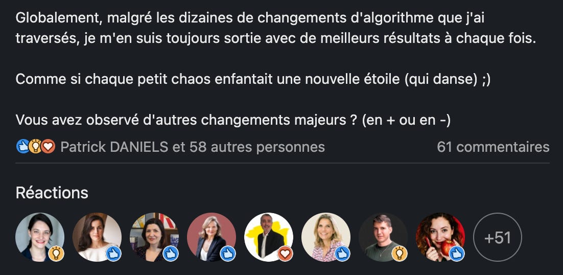 à chaque fois que les algorithmes Linkedin subissent des changements majeurs, je constate un schéma récurrent :