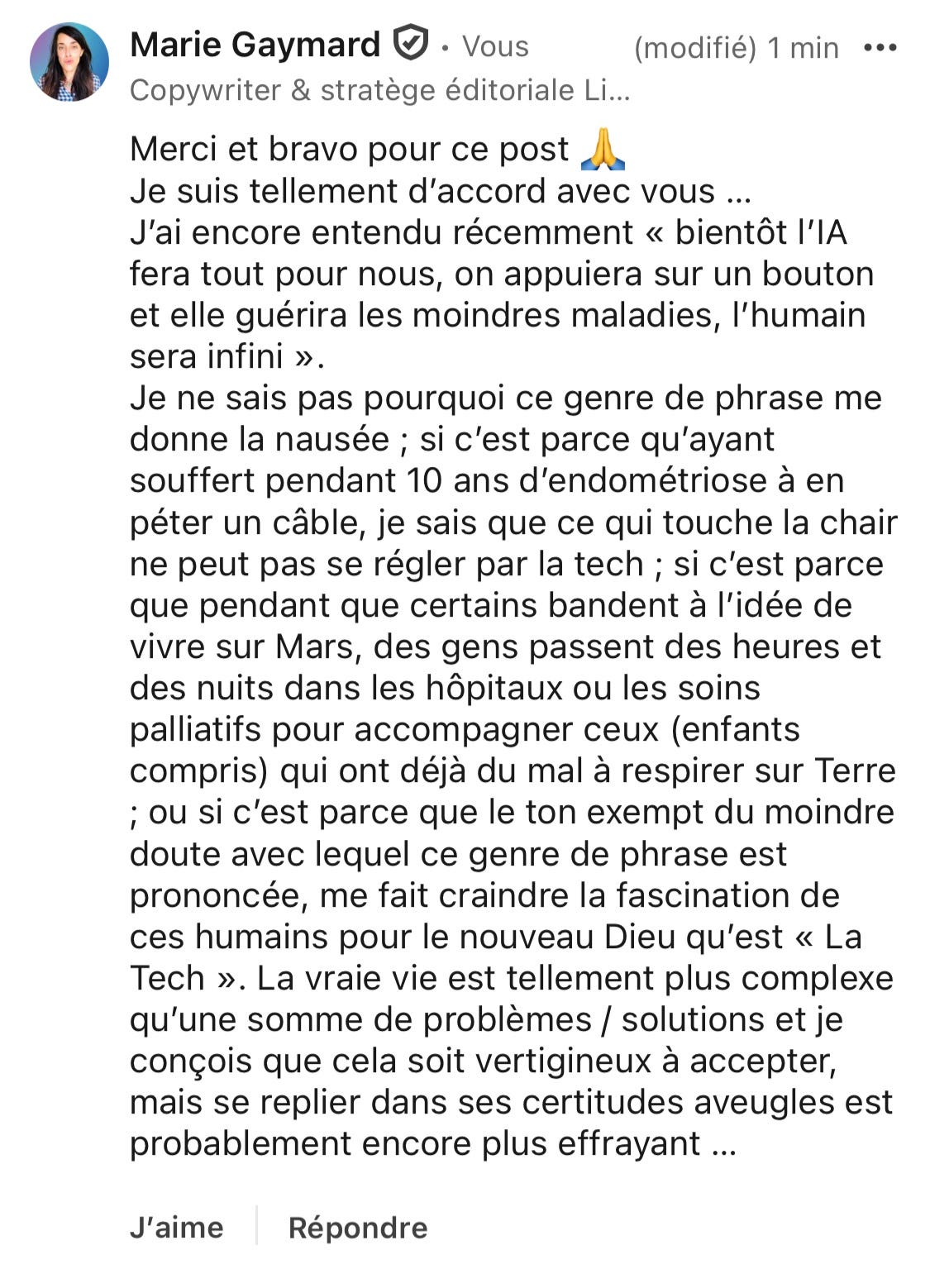 J’aurais pu faire un décryptage de l’actu Tech, une analyse de travaux de recherche sur l’impact de l’IA sur la créativité ou encore écrire un billet d’humeur sur les techs bros qui réduisent la vie humaine à un simple algorithme.