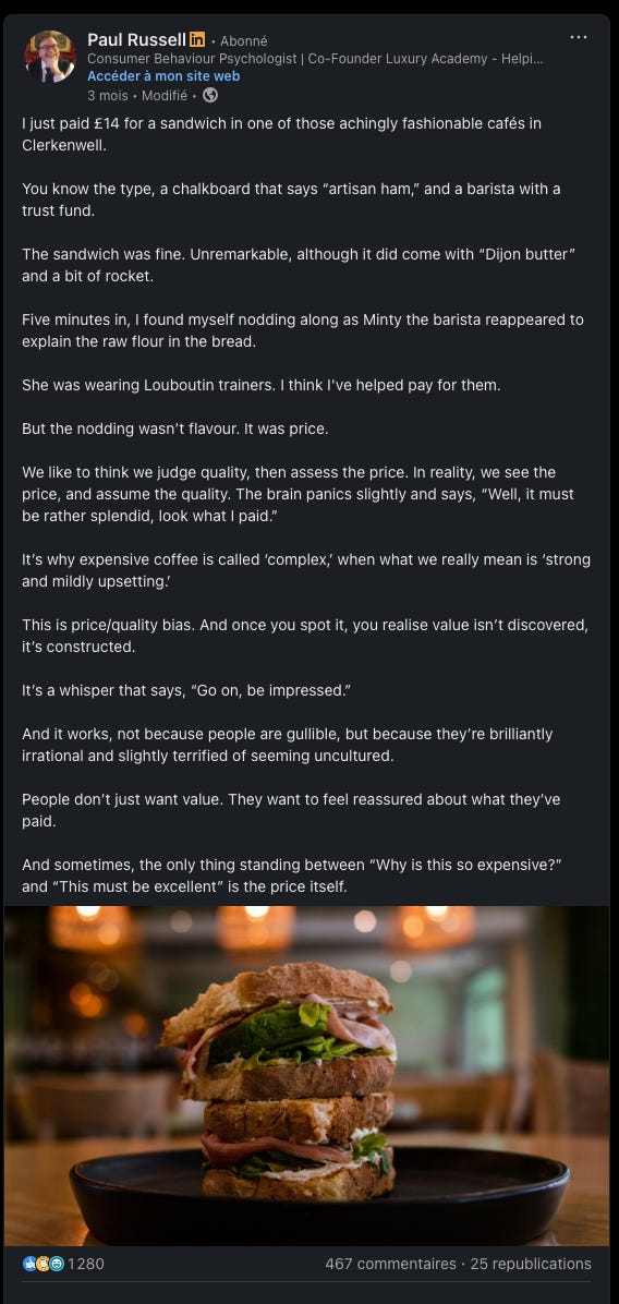 Dans ce post, Paul Russell, spécialiste des comportements de consommation, introduit le sujet très technique du “prix”, dans une anecdote qui parle à une audience bien plus large que sa cible.