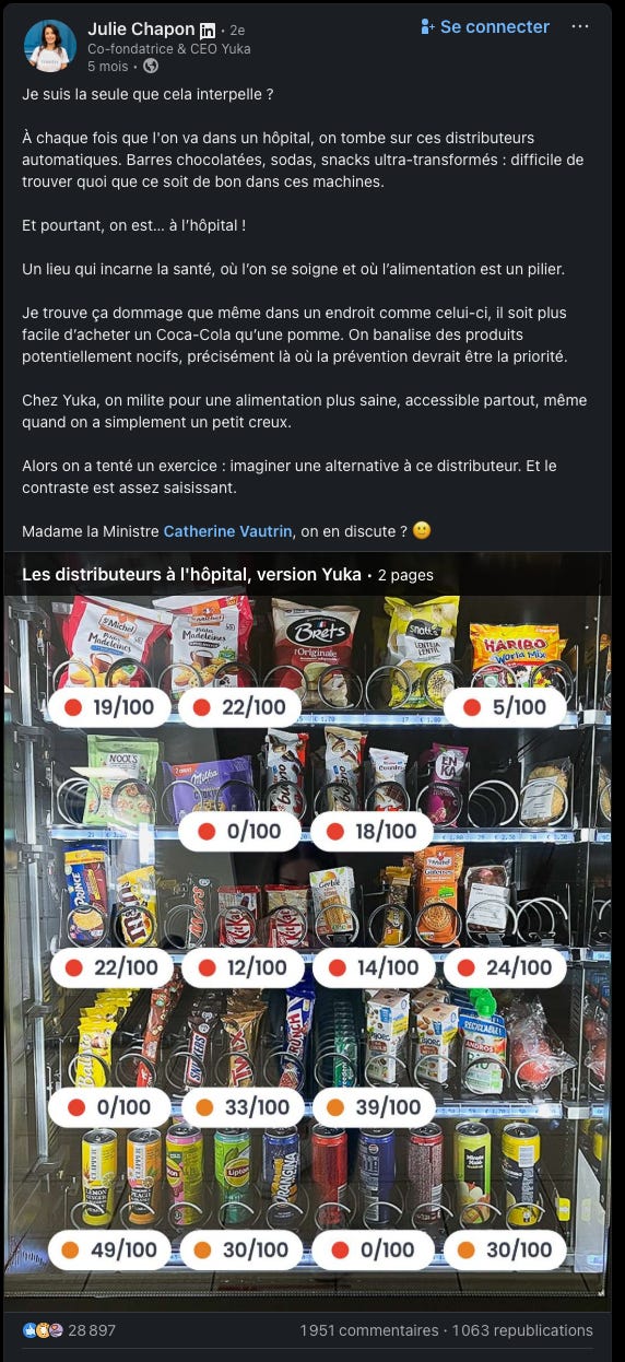 L’utilisation d’un sujet universel : les distributeurs de sucre et d’aliments mauvais pour la santé, dans un lieu dédié à la santé des gens - pour parler d’alimentation saine et plus spécifiquement encore de Yuka, son application de notation des aliments.