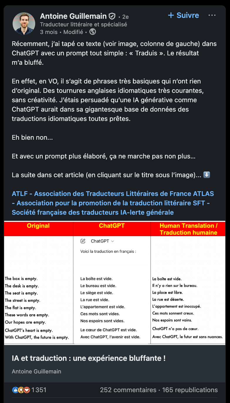 D’autres jouent sur le principe d’universalité avec brio, comme Antoine Guillemain qui montre que Chat GPT traduit 9 fois le terme anglais “empty” par “vide”, peu importe le contexte, là où un traducteur humain trouve 9 mots différents.
