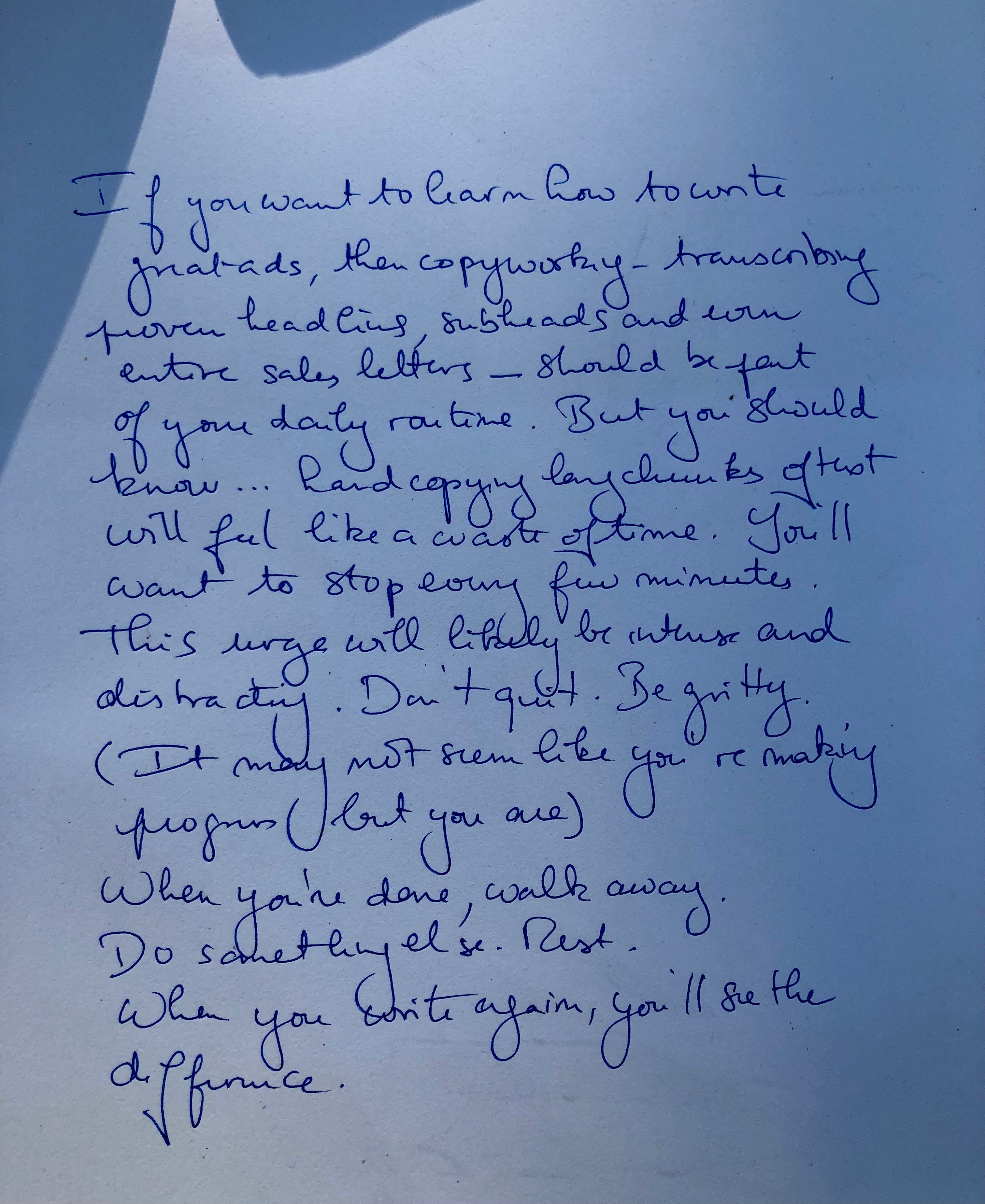 Il s’agit de recopier à la main un texte dont on aime le rythme, le style, la tonalité, le vocabulaire, le fond et de s’en imprégner pour progresser.