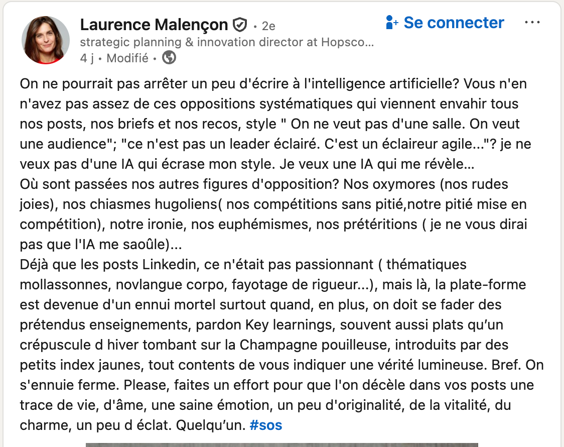 Mon verdict : je ne connais pas cette personne et je n’ai rien contre elle mais son post est une douleur à lire pour moi tellement il me laisse vide. Je ne sais pas s’il est écrit avec une IA ou si son auteure écrit comme une IA, mais…Plastique à 100%.