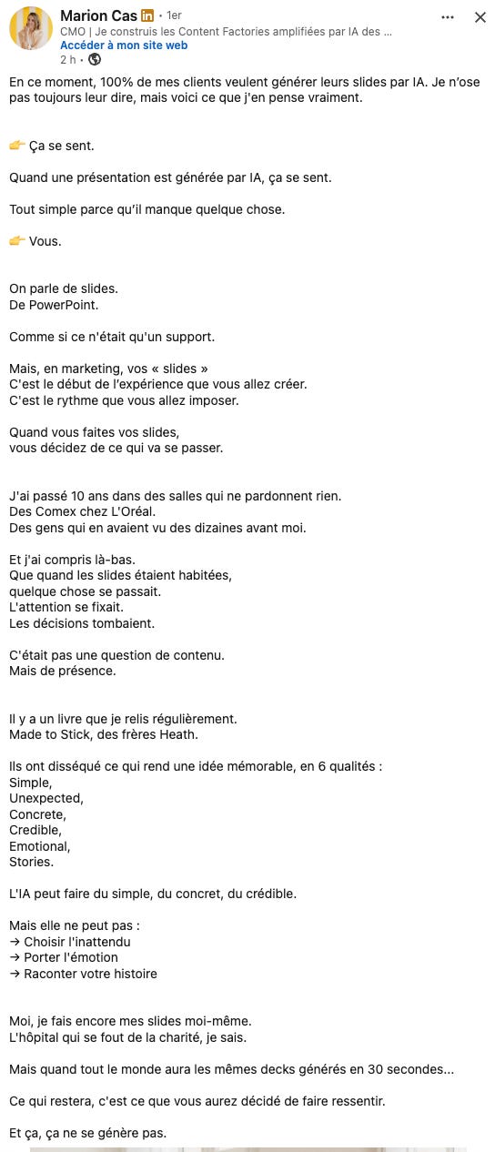 Verdict de Claude : “le post a une structure solide et un argument lisible. La séquence fonctionne : confession → claim ("ça se sent") → reframe (slides = expérience, pas support) → légitimité (L'Oréal Comex) → référence (Made to Stick) → application → autodérision → conclusion. C'est bien construit.”
