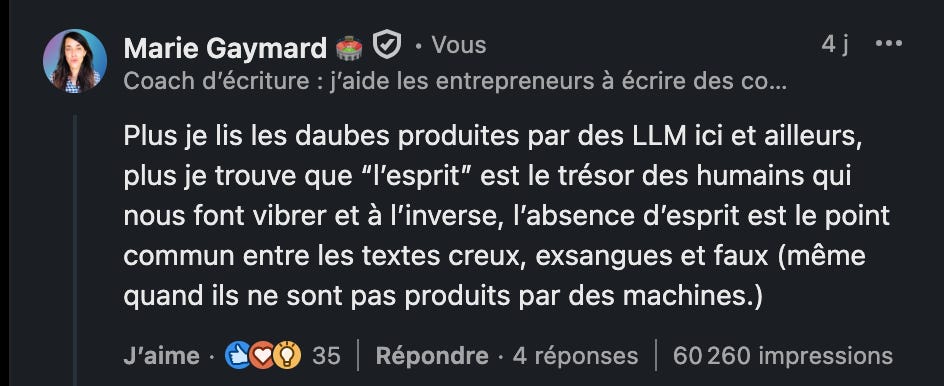 N’oubliez pas que le temps que vous passez à écrire SANS IA, n'est PAS du temps perdu, c'est votre entraînement à la clarté. Et votre “unfair advantage” qui prend du muscle, texte après texte.